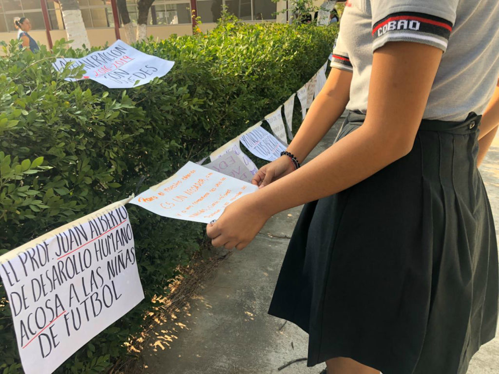 En cada “tendedero del acoso”, las alumnas coloraron en hojas de papel o cartulina los nombres de los profesores y los abusos de los que fueron víctimas, además exigían castigo para cada uno de ellos.