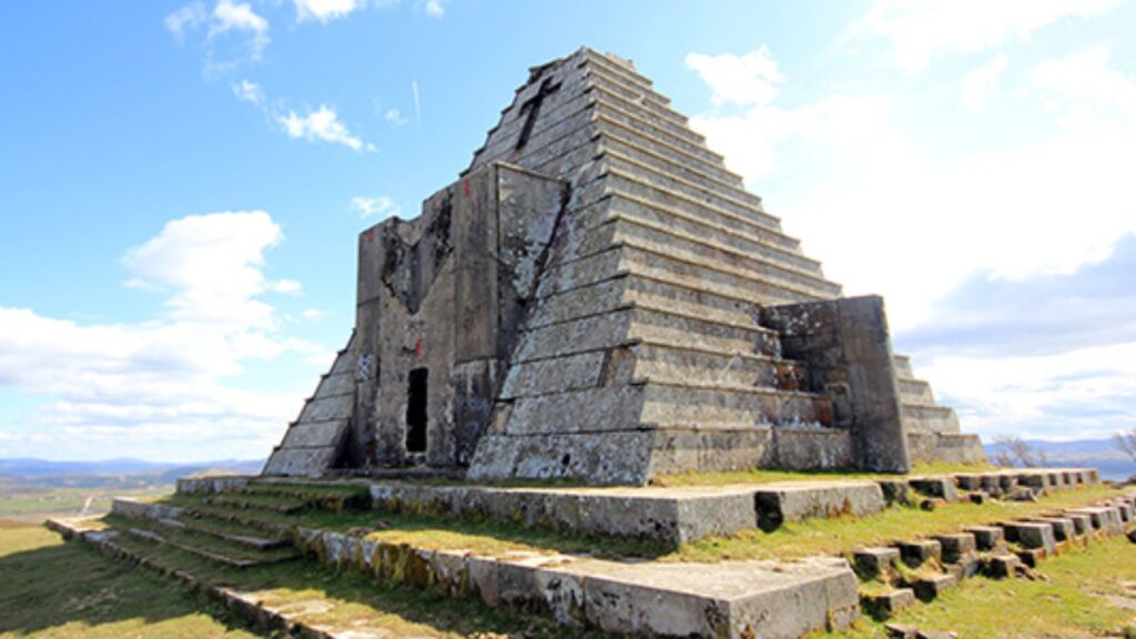 La pirámide de los Italianos tiene una altura de 20 metros de altura con una estructura en forma de pirámide y cubierta de placas de piedra caliza. Está en el Valle de Valdebezana, en Burgos.