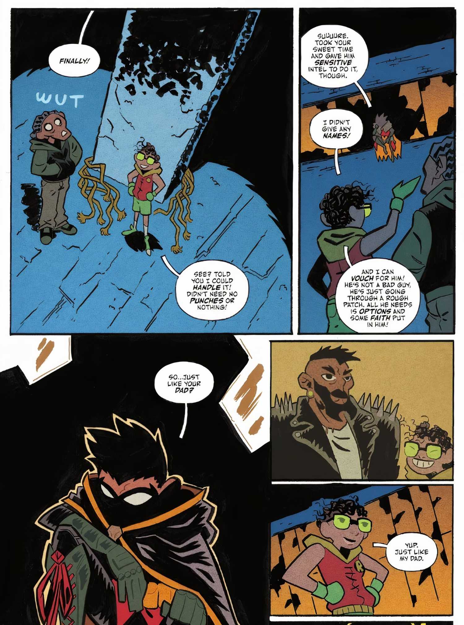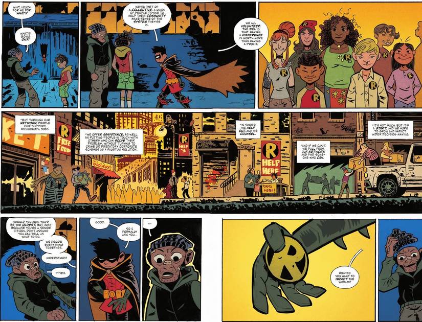 Al transmitir el legado de Robin a decenas de personas más, incluido un niño directamente afectado por uno de sus errores, Damian ha redefinido lo que significa ser Robin. También lleva esta redefinición más allá al crear esencialmente una Red Robin. Como explica Damian, él y los Robins representan “una unión de personas que intentan ayudar a su comunidad a darle sentido al sistema en el que se encuentran”. Esta red brinda apoyo, recursos, empleos y alimentos, ayudando a las personas a satisfacer sus necesidades sin recurrir al crimen ni ser víctimas de corporaciones depredadoras.