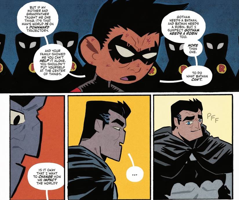 Al establecer esta red bajo el nombre de Robin, Damian ha transformado el manto en algo que tiene un impacto mucho mayor en la comunidad de Gotham. Esta es una hazaña que ningún otro Robin, ya sea Dick, Jason o Tim, ha logrado, ya que sus legados generalmente se centraban en actos heroicos individuales. En contraste, El enfoque de Damian convierte el legado de Robin en un símbolo de apoyo y empoderamiento de la comunidad. Por lo tanto, se podría argumentar que si esta historia se desarrollara en la continuidad principal, la versión de Robin de Damian dejaría el impacto más significativo y positivo en Gotham.