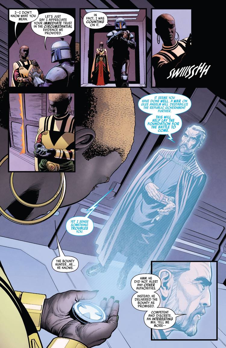 Como se ve en el nuevo Jango Fett#4 Por Ethan Sacks y Luke Ross, el legendario cazarrecompensas completa su trabajo para recuperar un artefacto robado conocido como “La esperanza de Glee Anselm”, que estaba destinado a unir a las especies rivales del planeta (los Anselmis y los Nautolans). Ambientado antes de los eventos de La amenaza fantasmaJango Fett recupera con éxito el artefacto y al mismo tiempo descubre su uso en una importante conspiración para desacreditar y humillar el cargo de Canciller Supremo del Senado de la República, Valorum. Sin embargo, Jango se guarda esta información para sí mismo, una cara que impresiona al hombre que estaba detrás de toda la crisis desde el principio: el Conde Dooku.