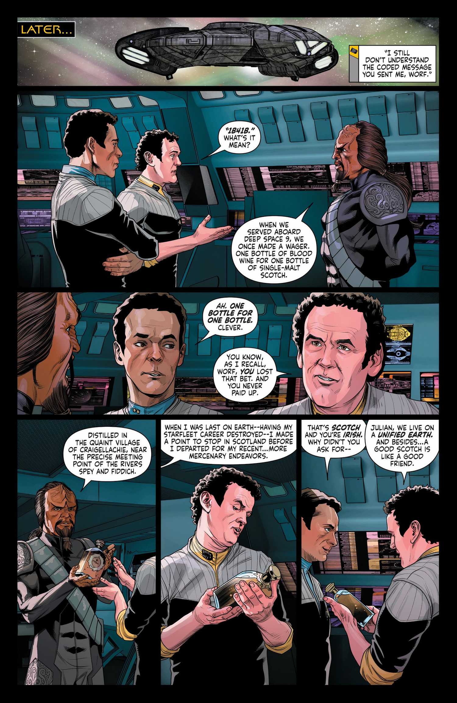 Star Trek: Desafiante El número 21, escrito por Christopher Cantwell y dibujado por Angel Unzueta, es la parte final de la historia de “Stars of Home”, en la que Worf y su equipo hicieron retroceder toda una invasión romulana. Tuvieron un poco de ayuda de O’Brien y otro Espacio profundo nueve incondicional: Julian Bashir. Después de que el polvo se calma, Worf le presenta a O’Brien una botella de whisky, haciendo referencia a una apuesta que hicieron años antes. Cuando Bashir señala que O’Brien es irlandés, no escocés, ignora las preocupaciones y dice “vivimos en una Tierra unificada”.