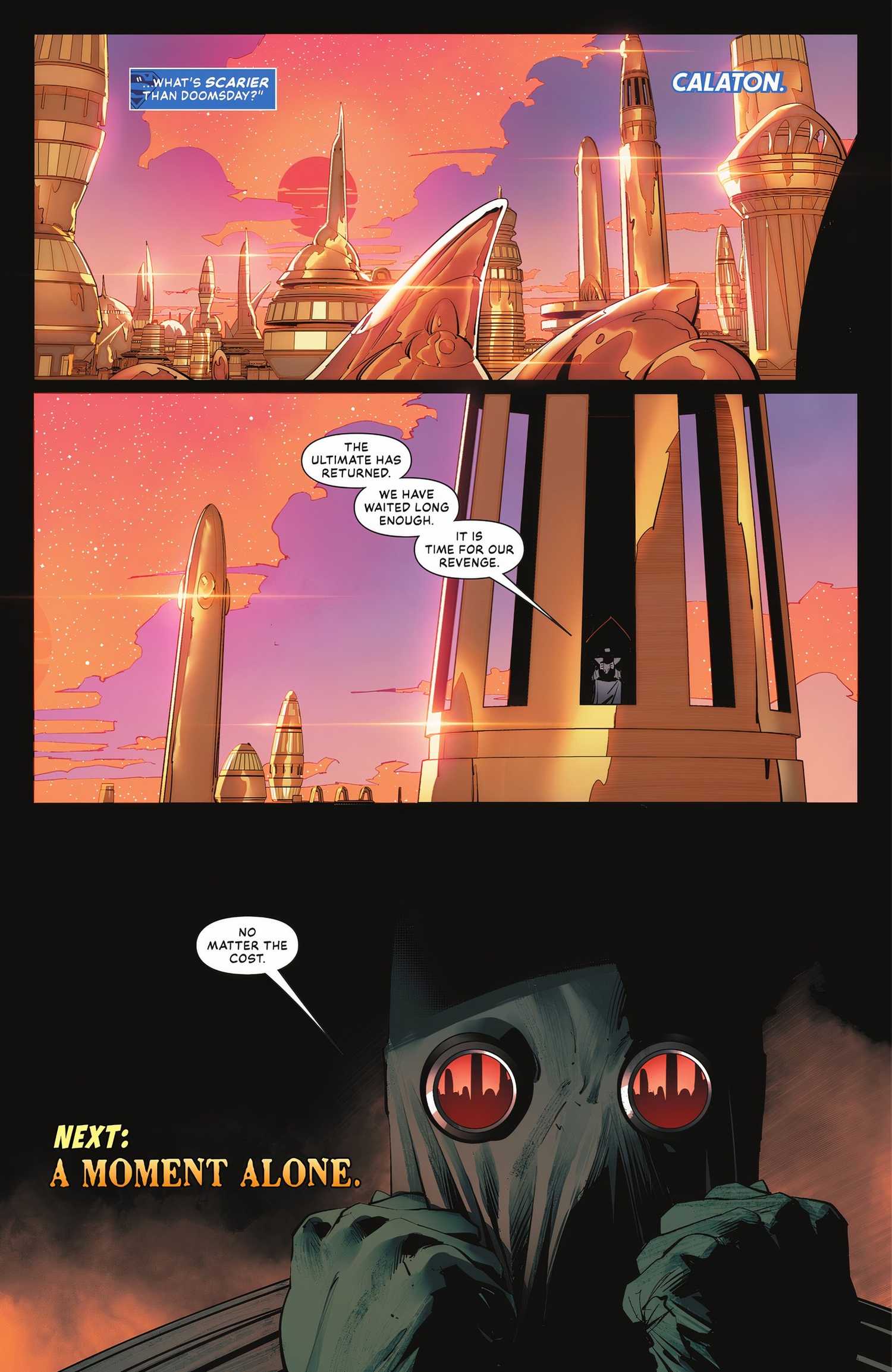 Superhombre El número 20 está escrito por Joshua Williamson y dibujado por Dan Mora. En la Tierra, Superman y Superwoman (Lois Lane) luchan para contener a Doomsday, que está arrasando Metrópolis. Después de masacrar al Parásito, Doomsday reanuda su ataque a Superman. Luego, la acción pasa al planeta Calaton, donde una figura solitaria señala que “el Supremo ha regresado” y que ha llegado el momento de la venganza. La figura se pone de pie y se pone una capucha verde sobre la cara, similar a la que llevaba Doomsday cuando escapó de la prisión.