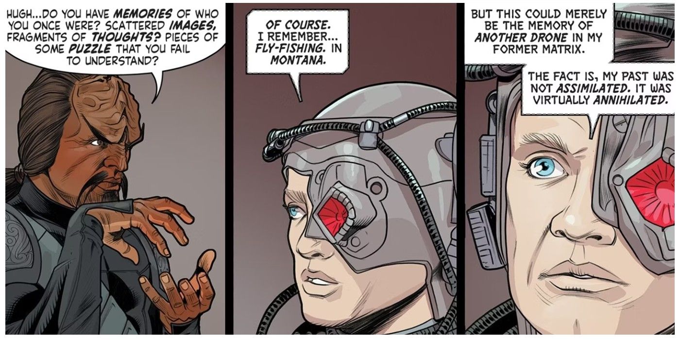 Star Trek: Desafiante El número 12 está escrito por Christopher Cantwell y dibujado por Angel Unzueta. Hugh está recuperando antiguos drones Borg, liberándolos del colectivo. Habla de su cruzada con Worf y un oficial de inteligencia de la Flota Estelar, quien le pregunta sobre su vida antes de ser asimilado. Hugh le dice a Worf que tiene recuerdos de la pesca con mosca en Montana.