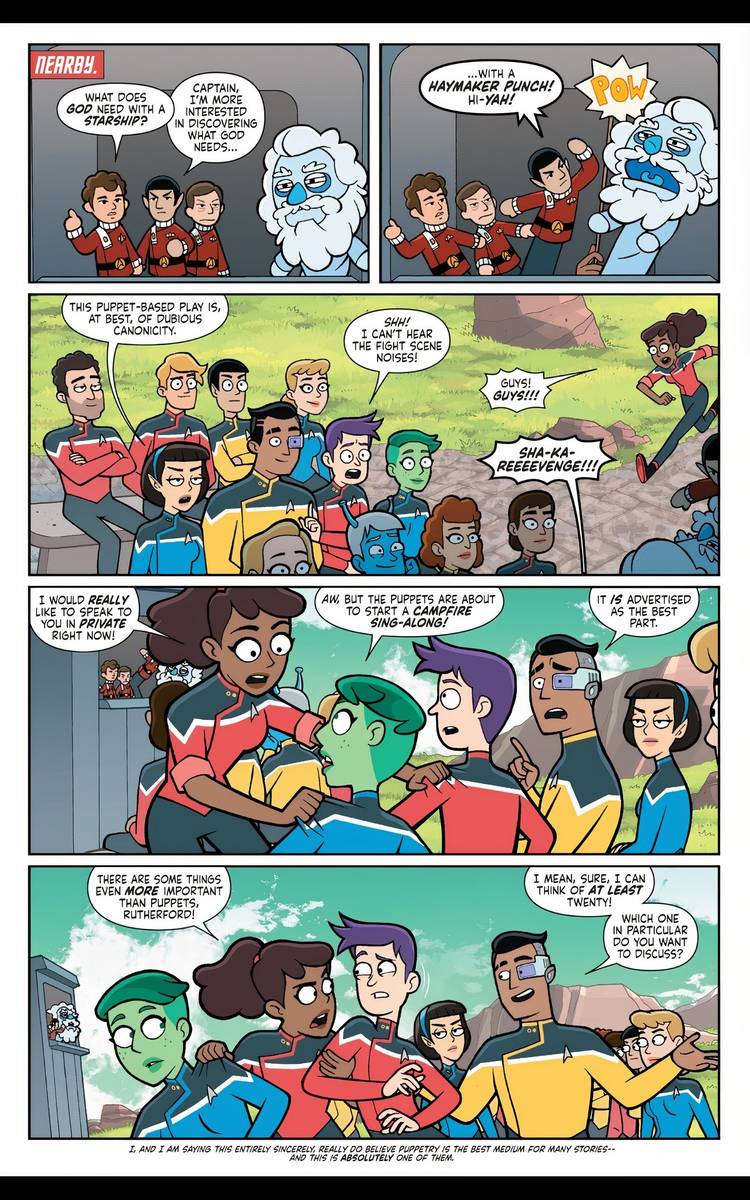 Star Trek: mazos inferiores #5 fue escrito por Ryan North y dibujado por Jack Lawrence. El Cerritos La tripulación disfruta de un tiempo de inactividad en la base de Arakia mientras el barco se somete a un barrido de barión. Algunos de los oficiales del barco están viendo una recreación de una títere de la conclusión de Star Trek V: The Final Frontieren el que Spock se enfrenta a “Dios”. El diálogo es diferente de la película, al igual que las acciones de Spock, lo que lleva a T’lynn a concluir “esta obra de títeres es, en el mejor de los casos, de dudosa canonicidad”.