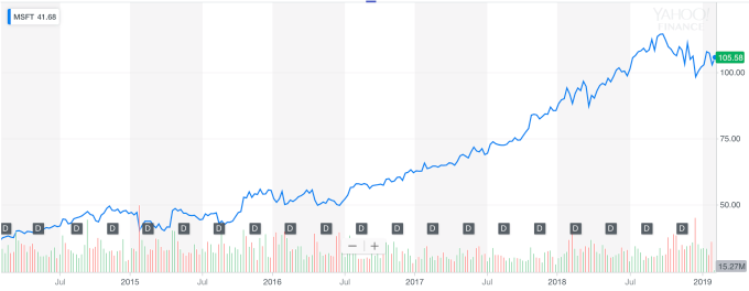 El viaje de cinco años del precio de las acciones de Microsoft bajo Satya Nadella. Gráfico de cotizaciones: Yahoo Finance