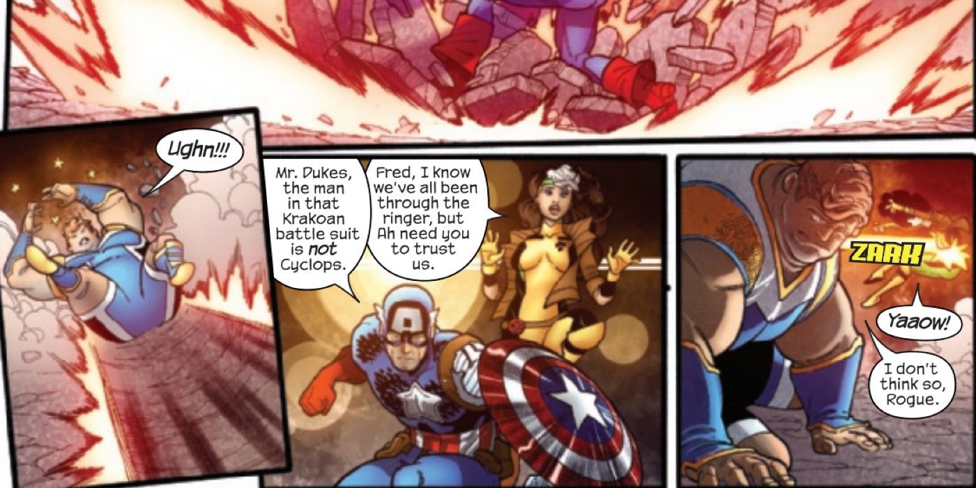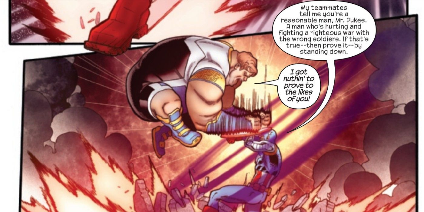 - El Capitán América convence con éxito a Blob de que abandone a Orchis y se una a los Vengadores, demostrando su capacidad para ver lo bueno de los villanos y convertirlos en activos.