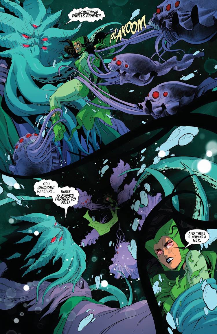 Si bien Moridun usó el traje verde original de 60 años de la Bruja Escarlata para burlarse e insultar al increíble héroe mágico, ese aspecto verde fue reemplazado rápidamente por uno mucho más inquietante. El número termina con Moridun poseyendo el cuerpo de Wanda, convirtiendo a la bruja Escarlata en un villano inspirado en Chthulu y obligando a Wanda a luchar dentro de su propia mente para recuperar el control de su destino.