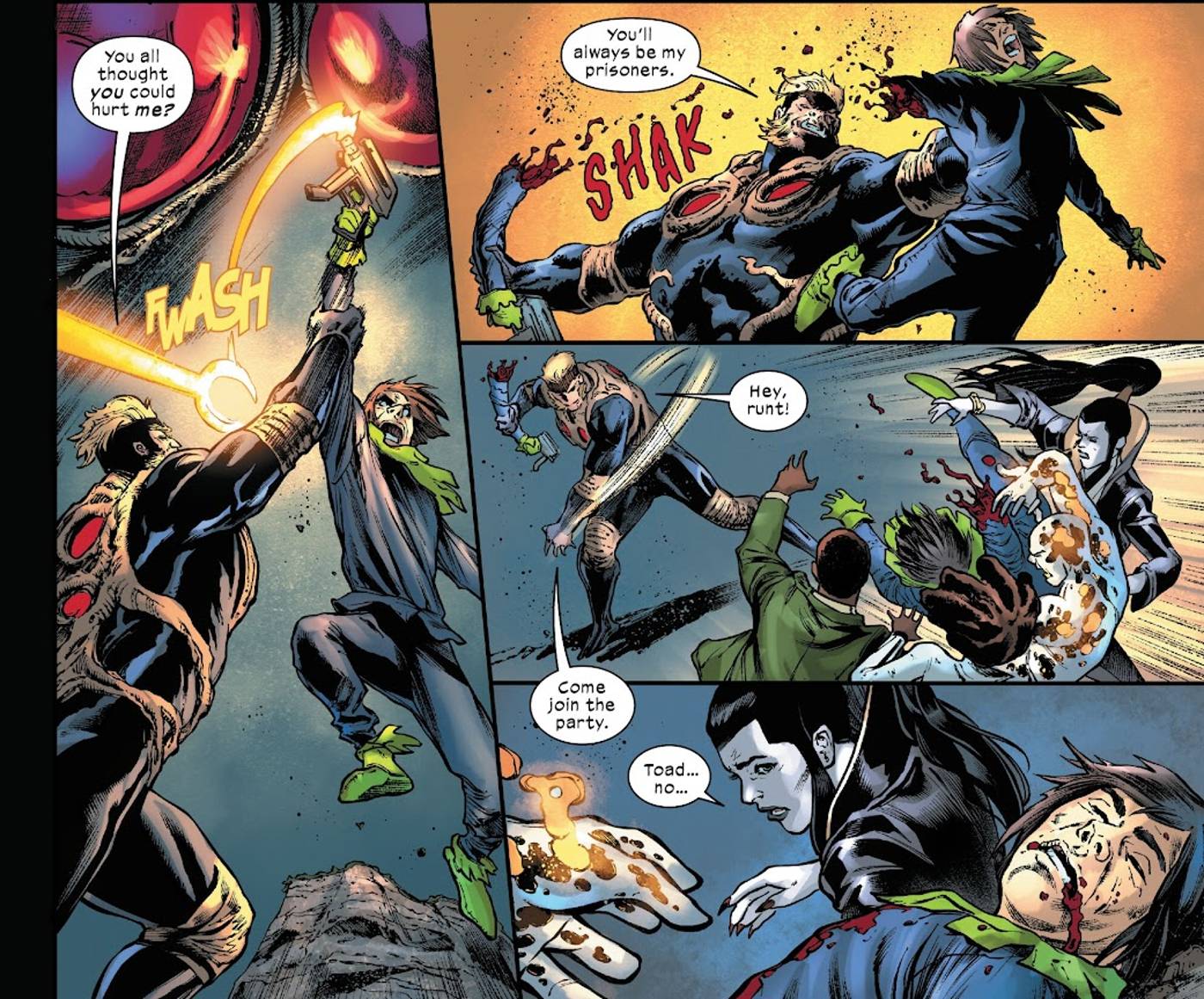 Mientras Toad logra arrebatar el arma que le quita poder con su lengua prensil, el movimiento solo lo convierte en un objetivo. En un movimiento brutal, Víctor le arranca el brazo y lo arroja a un lado. matando al villano que apareció por primera vez en 1964 X-Men #4.