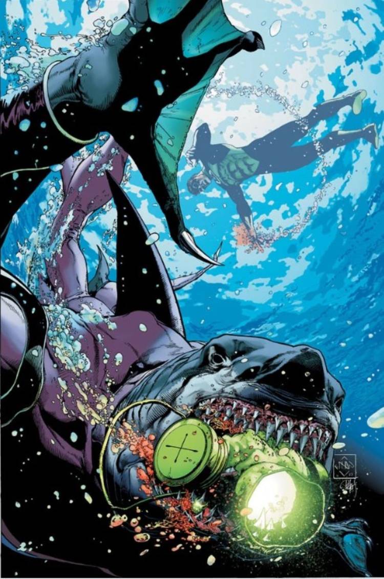 Linterna Verde confunde al tiburón rey con otro extraño hombre tiburón bípedo antropomórfico