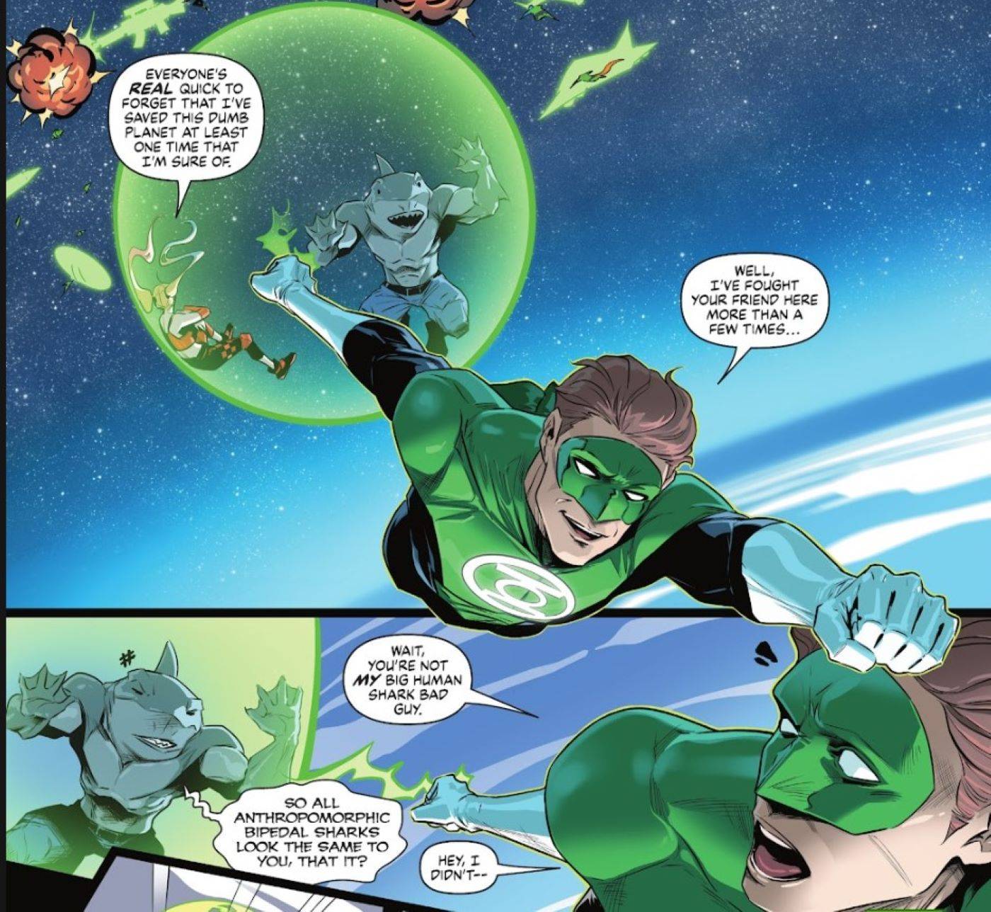 King Shark inmediatamente reprende a Hal y le dice: “Entonces todos los tiburones bípedos antropomórficos te parecen iguales, ¿verdad?” Antes de que Hal pueda responder, es alcanzado por un proyectil entrante, poniendo fin a este divertido intercambio y tal vez generando algo de karma cósmico. Sin embargo, es comprensible que Hal confunda a los dos villanos, dado lo similares que se parecen entre sí. Sin embargo, son dos personajes distintos. El Tiburón hizo su debut en Linterna Verde #24 (1963) de John Broome y Gil Kane, mientras que King Shark hizo su debut en Super chico #0 (1994) de Karl Kesel.