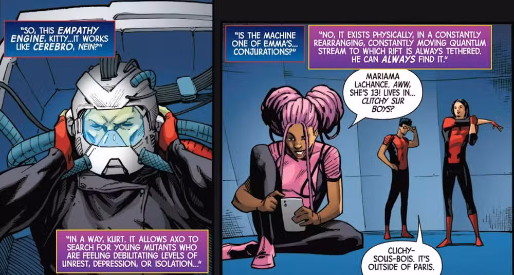 En el debut de Empathy Engine, Axo lo usa para identificar a un joven mutante con problemas en Francia y enviar un equipo para recuperarlo. El Engine parece una evolución natural de Cerebro, pero tan emocionante como este nuevo incógnita-tech, algunos fanáticos lo consideraron inmediatamente como un motivo de preocupación en el futuro.