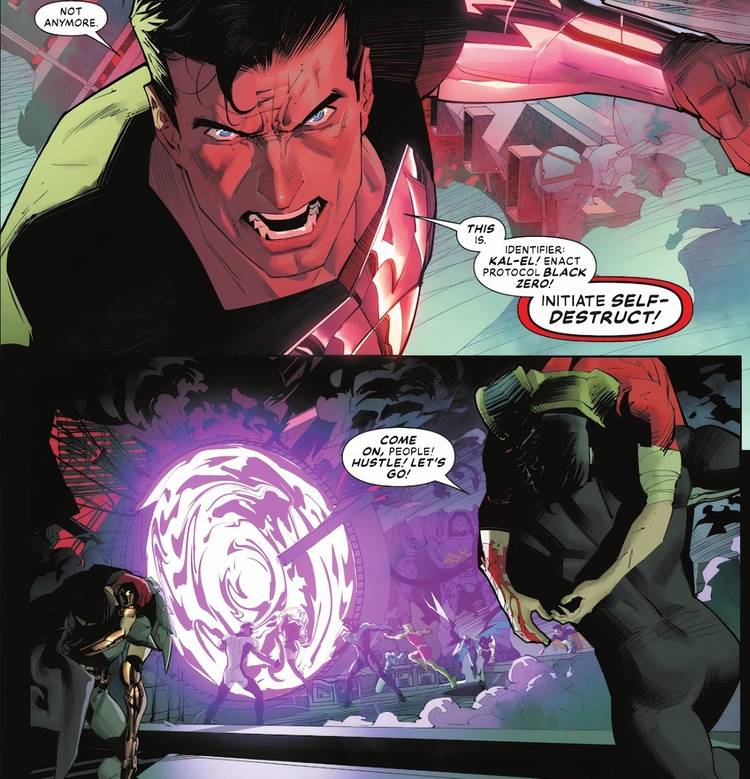 A pesar de que los héroes dan todo de sí en la batalla contra Global Guardian, Brainiac Queen y el cyborg Jon Kent, pronto queda claro que ni siquiera sus esfuerzos combinados y los trajes mejorados de la Liga de la Justicia son suficientes para cambiar el rumbo. En un intento desesperado por escapar de la captura, Nightwing y Blue Beetle logran establecer una salida de transporte para los héroes. Para asegurarse de que Jon, la Reina y Amazo no puedan seguirlos, Superman activa el protocolo de autodestrucción de la Fortaleza de la Soledad.gritos, “Identificador: Kal-El! ¡Ejecuta el protocolo Black Zero! ¡Inicia autodestrucción!” Los héroes logran escapar con éxito a través del portal justo antes de que la Fortaleza explote.