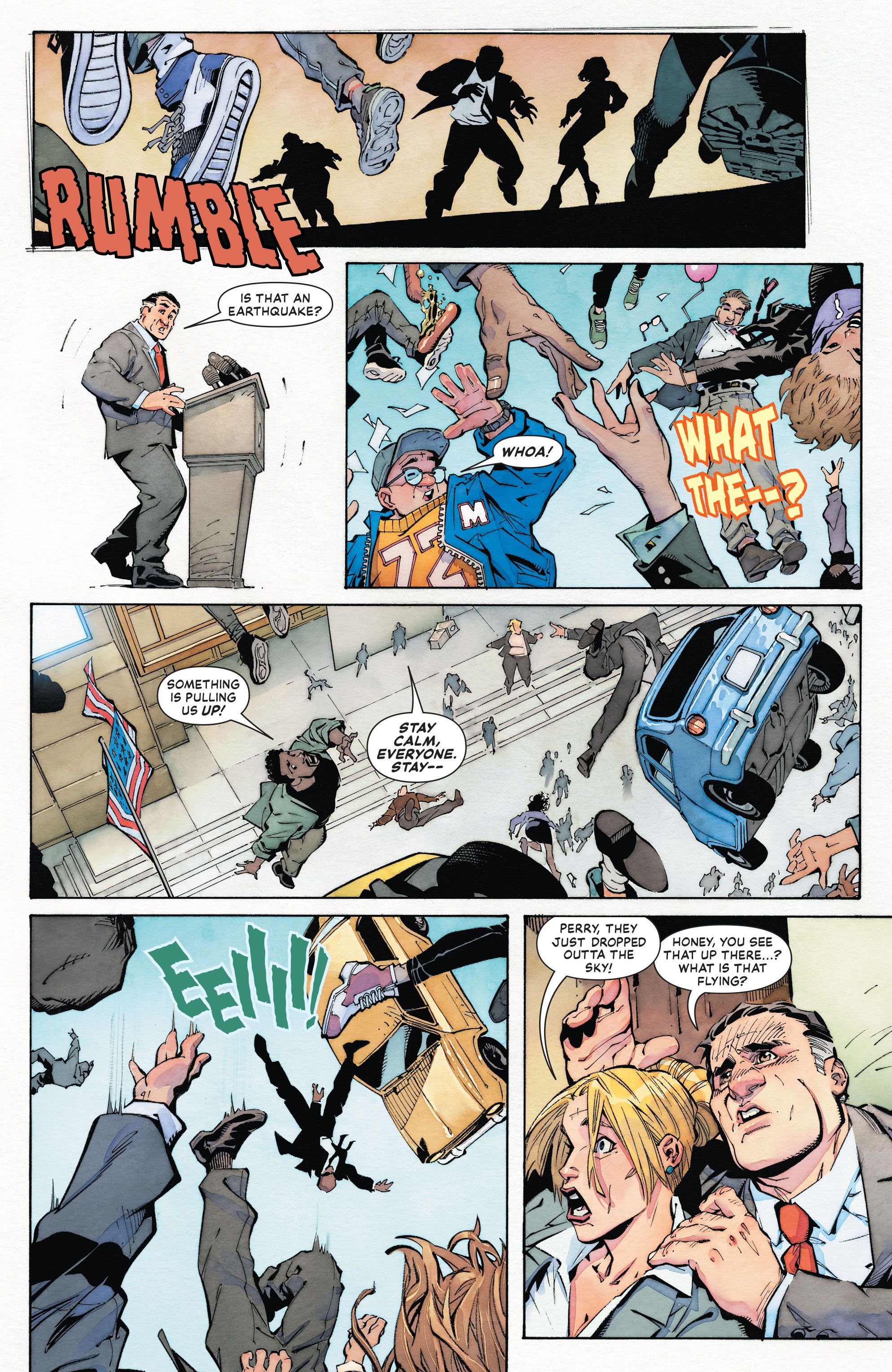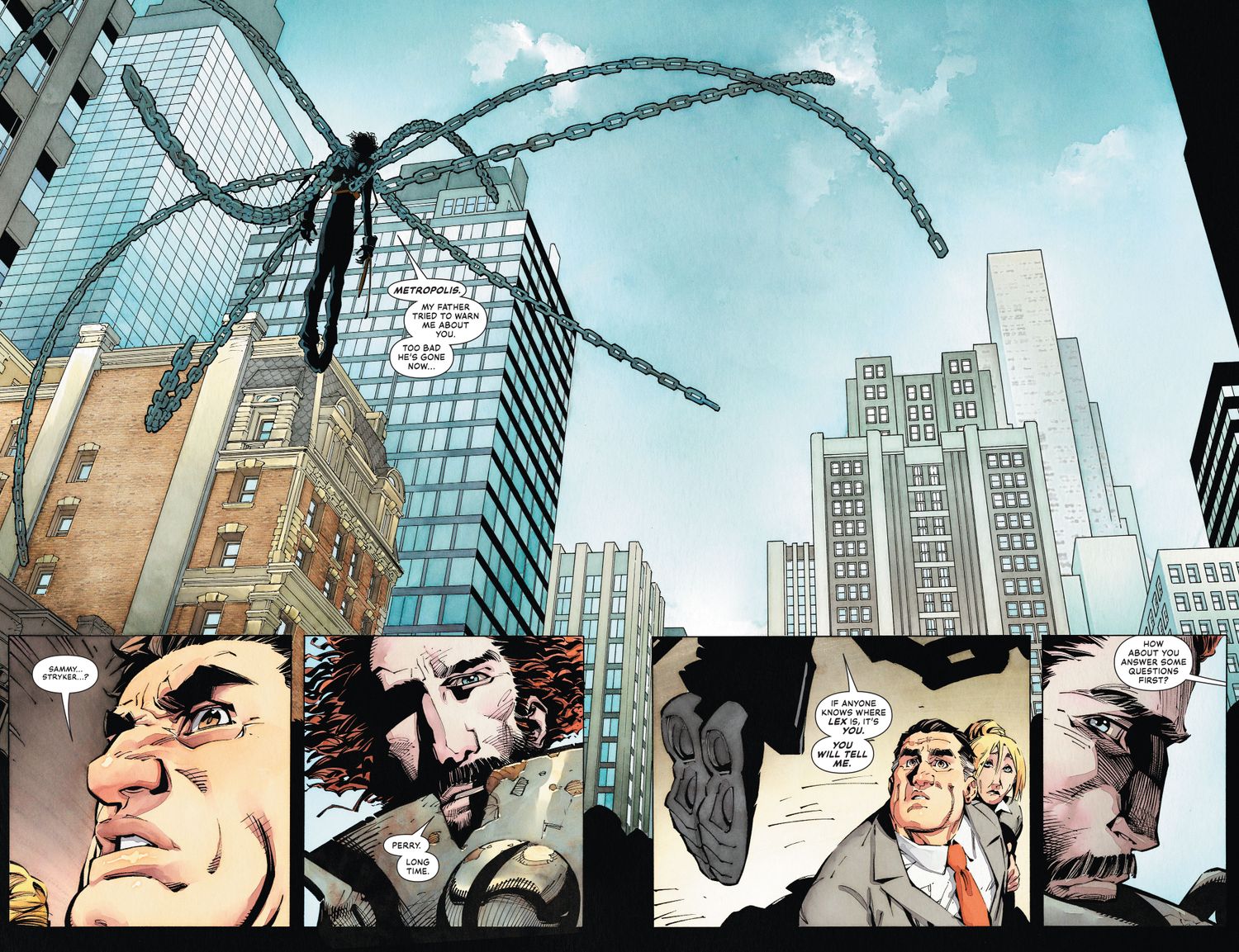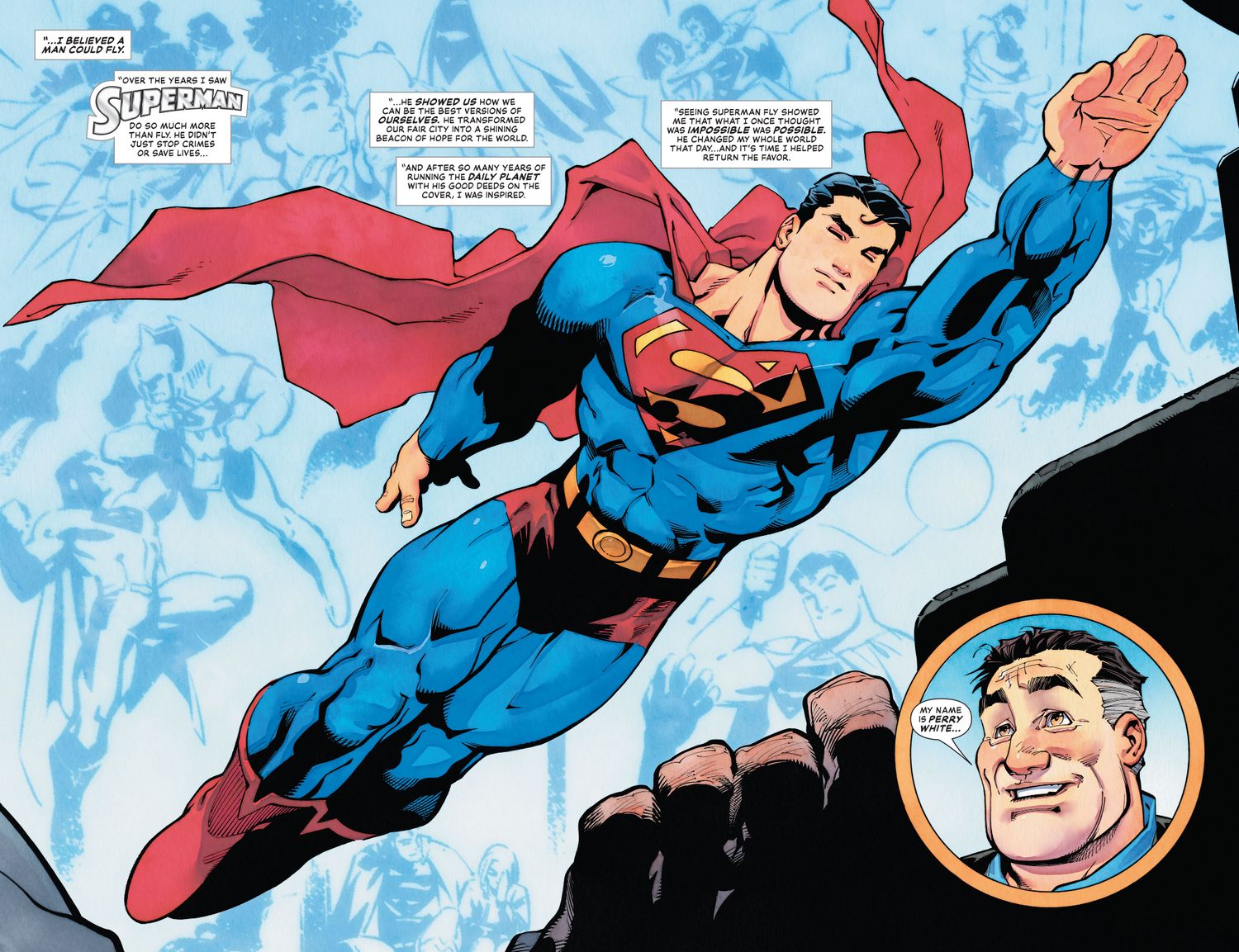 En un adelanto de superhombre #7 Por Joshua Williamson, Gleb Melnikov, Dan Jurgens, Norm Rapmund y Edwin Galmon, Perry relata la primera vez que conoció al Hombre del Mañana, asombrado ante la revelación de que un hombre realmente podía volar. El antiguo empleador de Superman menciona cómo el héroe inspira a los ciudadanos de Metrópolis a ser las mejores versiones de sí mismos. Y ahora que se ha recuperado de su problema médico, Perry está preparado para dar lo mejor de sí mismo al anunciar su candidatura a la alcaldía de Metropolis. Desafortunadamente, el gran día de White se ve arruinado por el nuevo enemigo de Superman, Encadenado, que se acerca a Perry y le exige saber la ubicación de Lex Luthor.