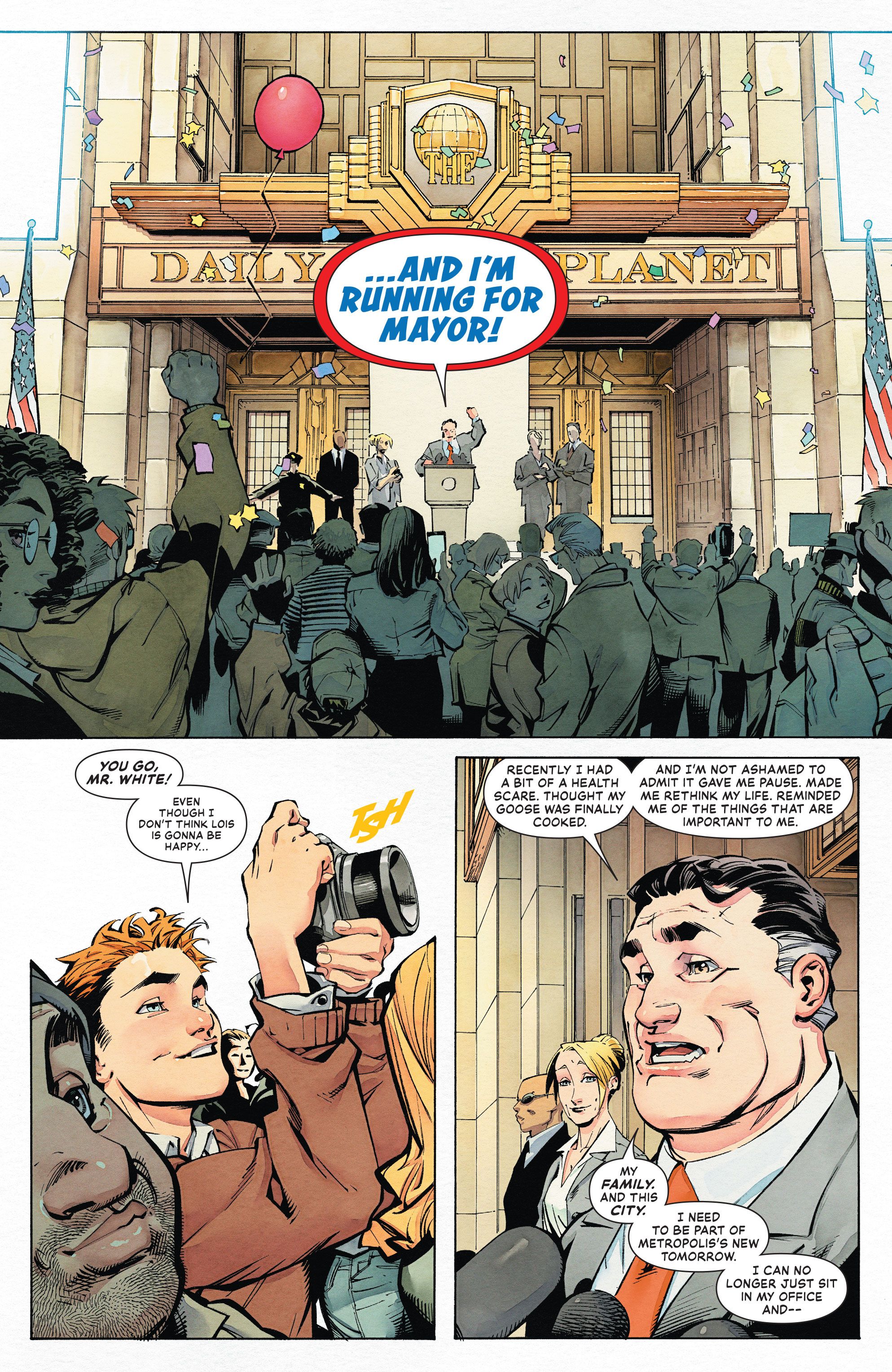 - Perry White, exjefe de Superman en The Daily Planet, se postula para alcalde de Metrópolis después de renunciar a su cargo debido a un derrame cerebral menor.