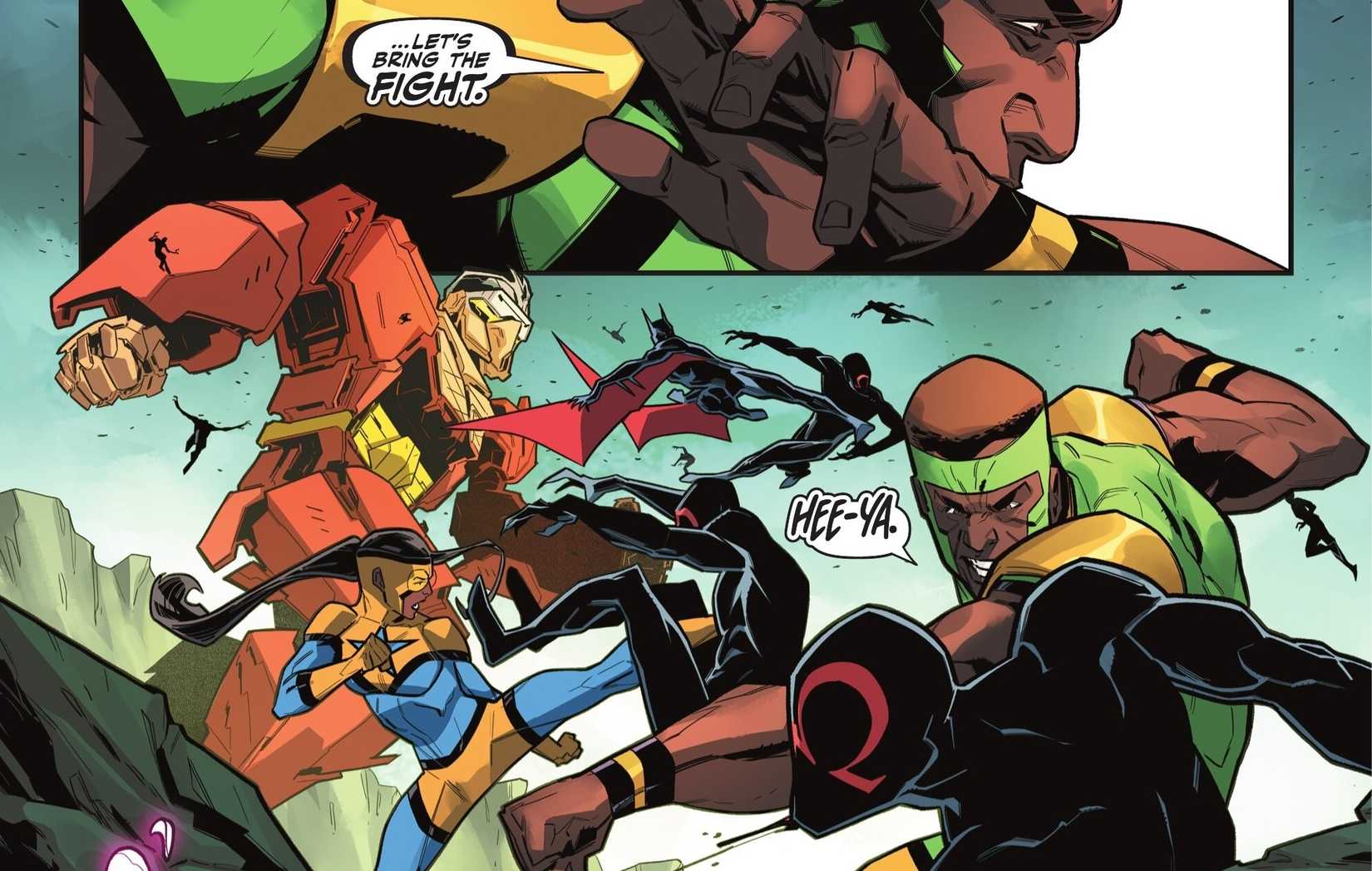 Esto ha llevado a múltiples versiones de los personajes existentes uno al lado del otro, y cuando surge una nueva misión de viaje en el tiempo, el Sr. Terrific es rápidamente voluntario en una de las versiones de Plastic Man. Como resultado, Patricio “Anguila” O’Brian logra una de sus mejores transformaciones hasta ahora: un mech gigante.