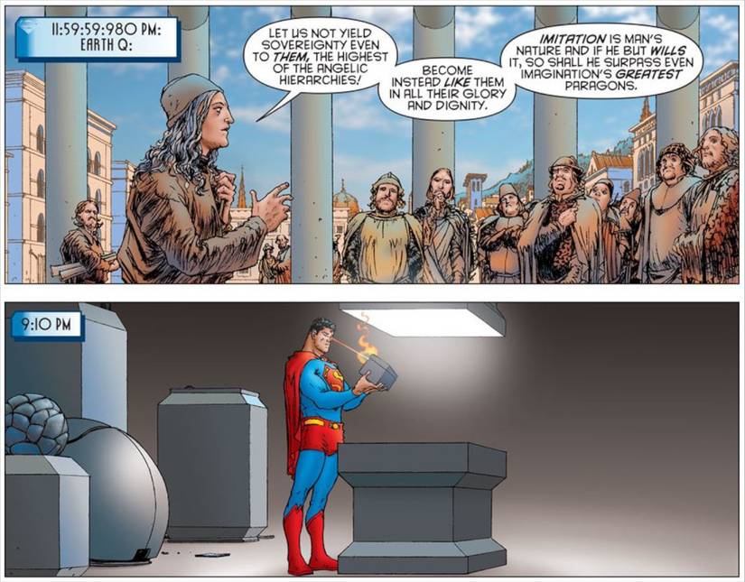 Superman estelar El número 10 también tiene una trama secundaria sobre Earth-Q, un experimento que el Hombre de Acero realiza en un universo bebé para ver cómo sería una Tierra sin Superman. A medida que se desarrolla Earth-Q, los lectores pueden vislumbrar brevemente al filósofo italiano Pico della Mirandola en el siglo XV, pronunciando un discurso público que luego se publicaría como el Oración sobre la dignidad del hombre: