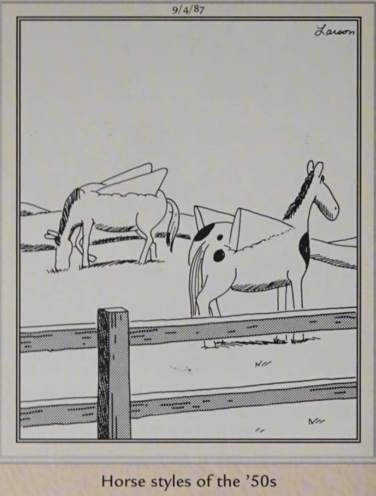 Este Lado lejano El chiste de caballos levantará las cejas, no porque su significado sea difícil de descifrar, sino porque su pitaje se siente tan cerca de “telefonado” como Gary Larson alguna vez. Subtitulado “Estilos de caballos de los años 50“Representa dos caballos en un pasto con aletas unidas a sus espaldas, evocando una estética automática de retroceso.