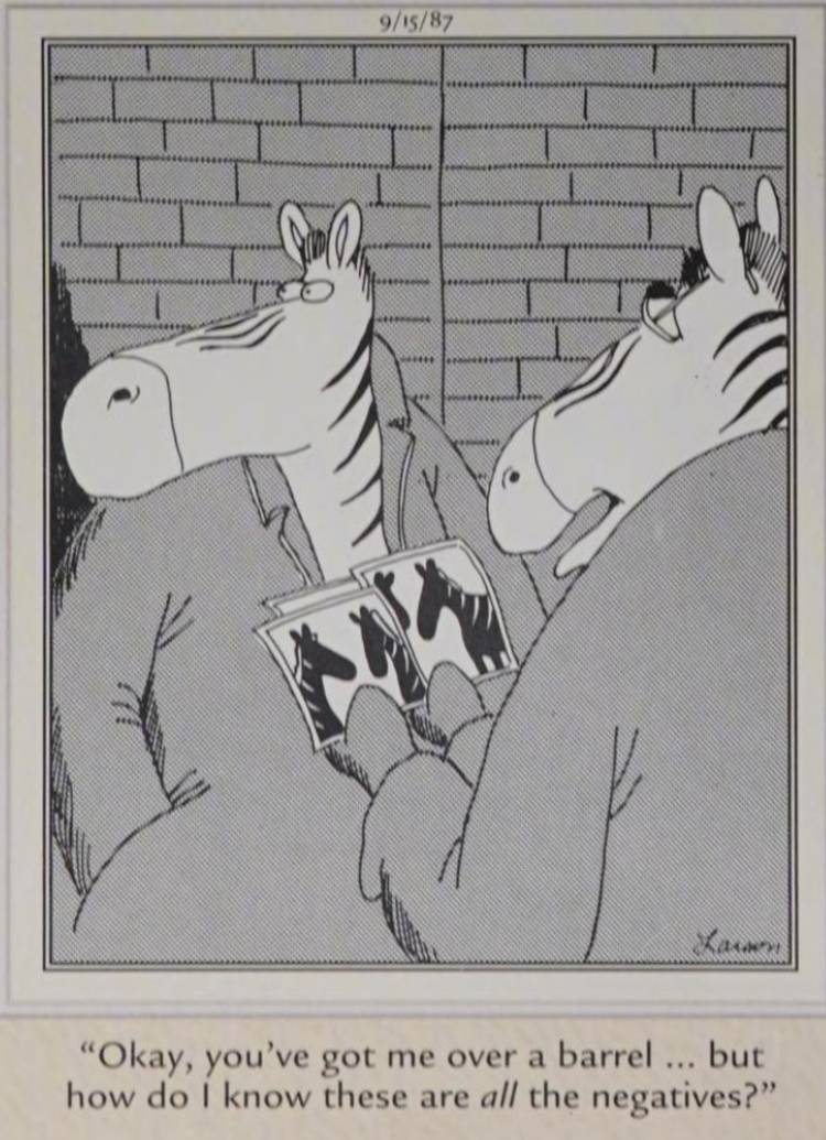 “¿Cómo sé que estos son todos los negativos?“Una cebra en una gabardina le dice a otra en este Lado lejano dibujos animados; Evidentemente, la primera cebra está chantajeando la segunda. La broma, por supuesto, es que los animales en blanco y negro, en forma fotográfica, tienen sus esquemas de color invertidos. Es uno de los gags de Gary Larson, se puede argumentar que es demasiado inteligente para su propio bien.