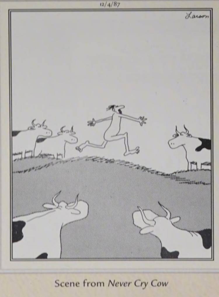 En este caso, es una devolución de llamada a la película de 1983 Nunca lloras lobo. Al intercambiar vacas por lobos carnívoros aquí, Larson transmuta totalmente el significado de la broma. Incluso si uno atrapa la referencia en juego aquí, la respuesta más probable a esto Lado lejano La caricatura es un rollo de ojos enfático.