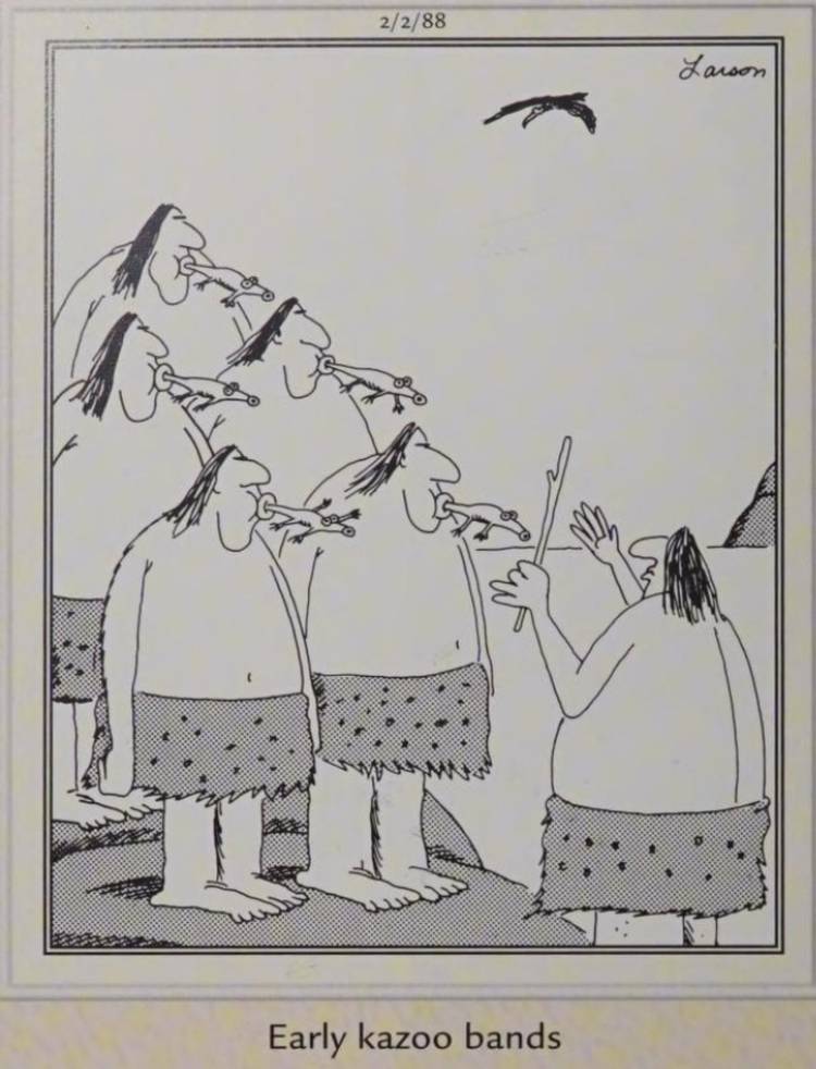 La ridiculización de innovaciones humanas prehistóricas fue un pasatiempo favorito de El lado lejanopero aquí, Gary Larson salió más de una extremidad de lo habitual, representando “Bandas Kazoo tempranas“Como usar algún tipo de salamandras antiguas como sus instrumentos. El absurdo visual de la broma es lo que tiene la mejor oportunidad de hacer reír a los lectores, mientras que la premisa es puramente ridícula.
