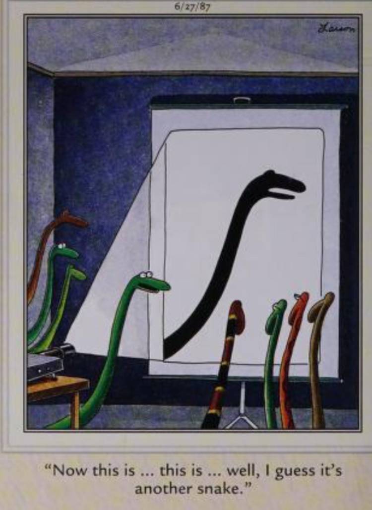 Recolectar amigos para mirar una muestra de diapositivas de fotos de vacaciones puede parecer arcaica ahora, pero para Gary Larson, fue un elemento básico de la cultura estadounidense, una que El lado lejano frecuentemente burlándose de. Aquí, Larson ofrece un clásico “parado frente al proyector” Visual Gag, excepto con serpientes como personajes.