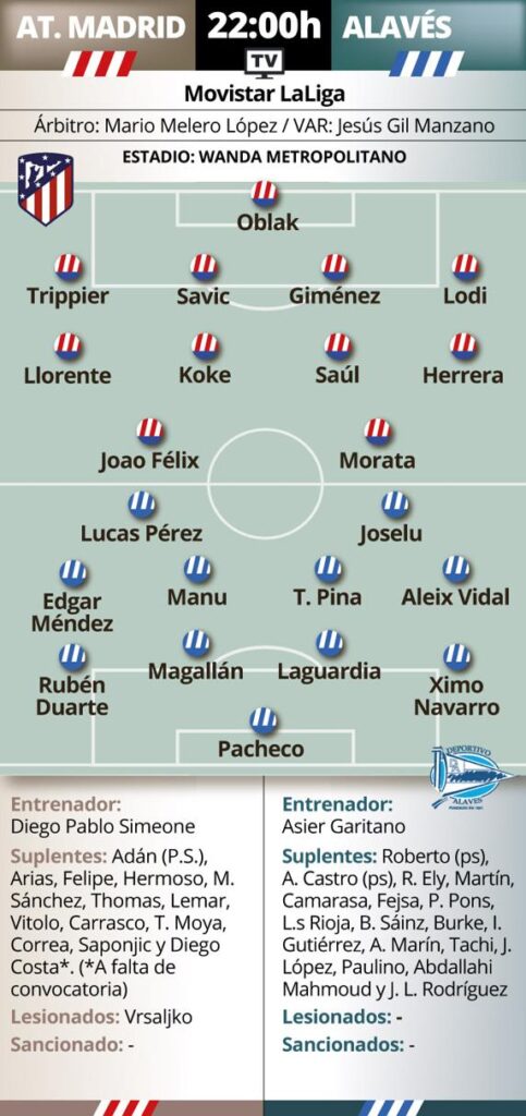 El choque de esta noche en Madrid mide a dos equipos en situaciones muy distintas. Los de Simeone, tras el regreso de la competición, no conocen la derrota y han logrado tres victorias consecutivas que les han impulsado en la tabla hasta la tercera posición. Si ante el Alavés logran también el triunfo, firmarían su mejor racha de victorias seguidas de toda la temporada.