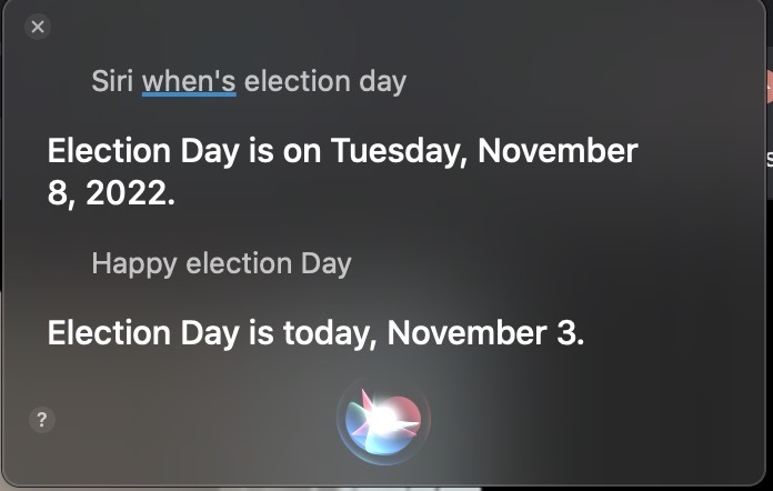Desde entonces, Apple ha solucionado el problema, aunque el problema parece ser que Siri saltó el arma aquí. El 8 de noviembre es, de hecho, día de elecciones. Pero no este año. El 8 de noviembre de 2022 marca otra elección importante aquí en los EE. UU., A saber, las elecciones de mitad de período, que sin duda serán todo tipo de diversión y estresante a su manera. Una fuente inagotable de ansiedad, esa cosa hermosa que los antiguos griegos llamaban “democracia”.