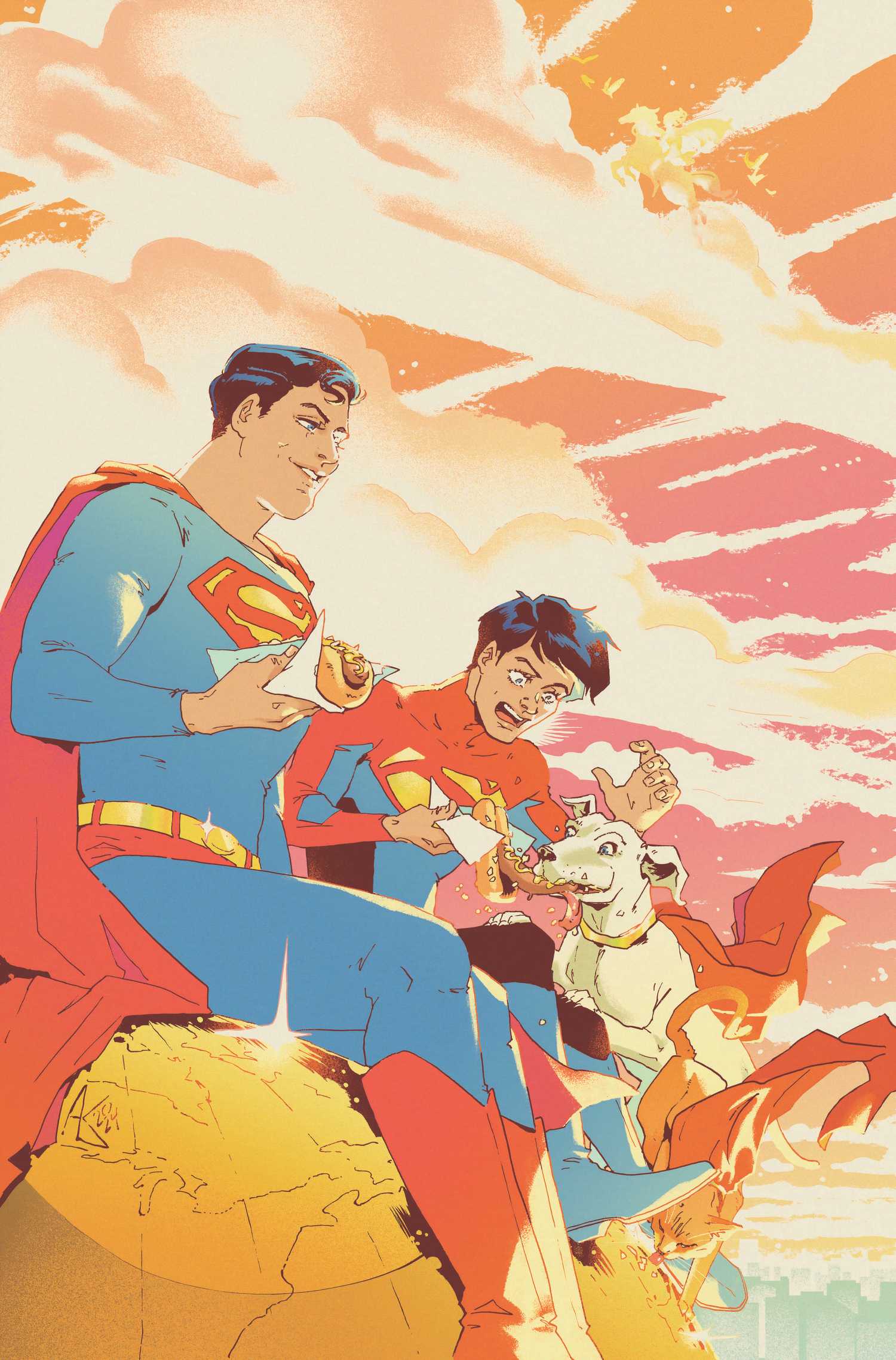 En esta impresionante obra de arte de Kaplan, Superman y su hijo disfrutan de un momento de paz en las nubes, compartiendo hot dogs con su amigo Krypto, quien les otorga Un respiro muy necesario de los tiempos oscuros en los que se encuentran..