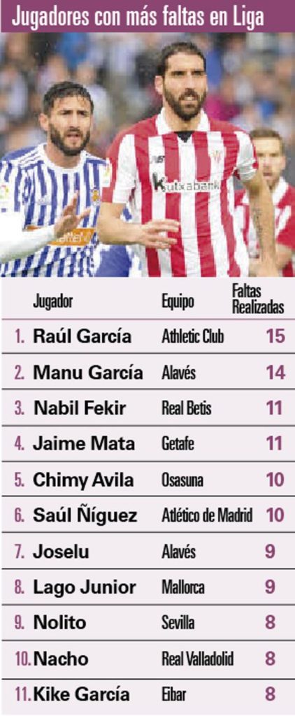 El ránking está liderado por Raúl García (Athletic), con 15 faltas cometidas en lo que llevamos de torneo. Pero después del rojiblanco le siguen hasta cuatro hombres ofensivos pero con muchas faltas ya a sus espaldas: Manu García (centrocampista ofensivo del Alavés) ha cometido 14 faltas, Nabil Fekir (delantero del Betis) y Jaime Mata (delantero del Getafe) encadenan 11 faltas, y Chimy Ávila (delantero de Osasuna), ha realizado 10 faltas hasta el momento.