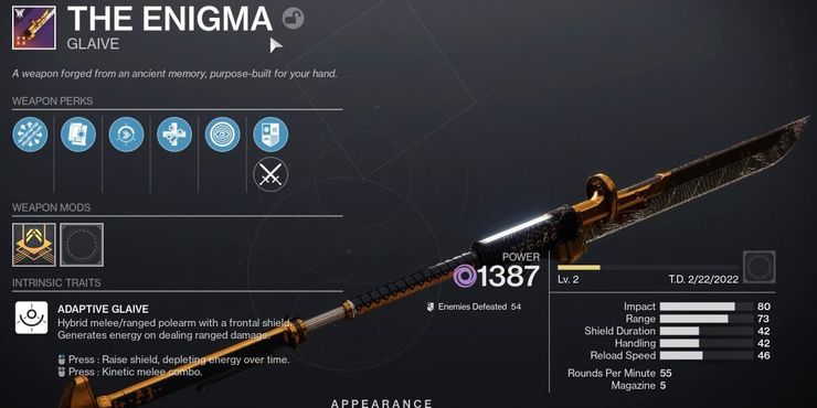 la reina bruja ha introducido una gran cantidad de características nuevas, y una de las más impactantes es un tipo de arma completamente nuevo, el glaive. El Enigma es el primero de su tipo, lo que permite el combate cuerpo a cuerpo de cerca, el daño de proyectiles y los escudos, todo en una sola arma.