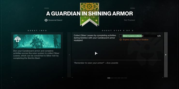 La búsqueda de A Guardian in Shining Armor continúa ampliando lo que introdujo Celebrating Solstice, específicamente obteniendo más Silver Leaves, Silver Ash y Kindling, además de actualizar el conjunto Candescent Armor. Para completar la misión, los Guardianes deben estar preparados para usar su armadura Candescente no mejorada para ganar Hojas plateadas y Ceniza plateada. Además, será necesario completar los Desafíos de eventos, por lo que los Guardianes deben priorizar los desafíos del Solsticio que son más fáciles de completar en Destino 2 primero.