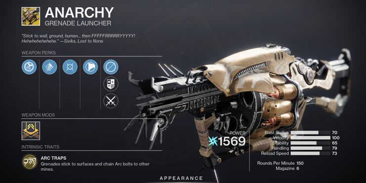 Como la mayoría de las armas exóticas en destino 2Anarchy viene con ventajas establecidas: Comida rápida, Rondas de alta velocidad, Objetivo en movimientoy Acciones compuestas. Lo que hace que el arma sea tan codiciada por los guardianes es el rasgo intrínseco, las trampas de arco. Esto convierte las granadas de Anarchy en minas que encadenan rayos de arco a otras minas. El rasgo Arc Traps convierte el arma en una de las mejores opciones tanto para ADD clear como para jefe DPS. Simplemente derribar las minas de arco cerca de un grupo de enemigos puede despejar una habitación. Cuando te enfrentas a un jefe, la estrategia es disparar dos rayos y luego cambiar a otra arma. Esto infligirá constantemente daño de arco al enemigo y se puede replicar a lo largo de la pelea.