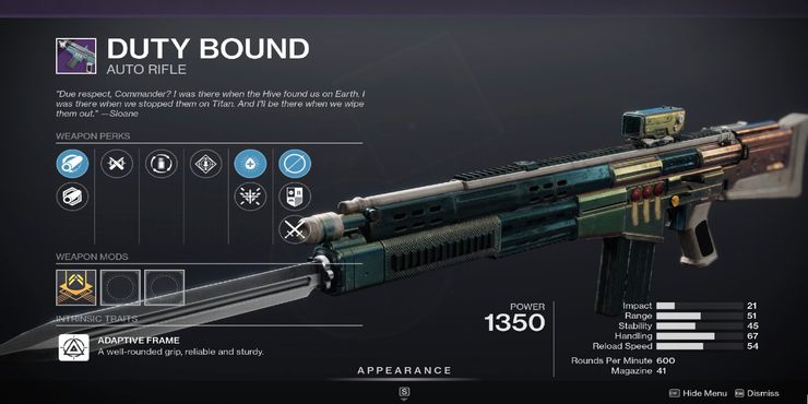 Lo que hace que Duty Bound se destaque en PvE es su facilidad de uso y sus excelentes rasgos/estadísticas. El arma tiene un manejo muy alto y es fácil de controlar ya que dispara a 600 RPM. Es una versión de disparo más controlable y más lenta de destino 2 nuevo Krait, que es un arma Rapid-Fre Frame que dispara a 720 RPM. Aunque el Duy Bound dispara más lento que el Krait, lo compensa con un fuerte golpe. Su mayor impacto se puede combinar con rasgos de daño de primer nivel como Rampage y One For All para crear un arma potente para eliminar enemigos.