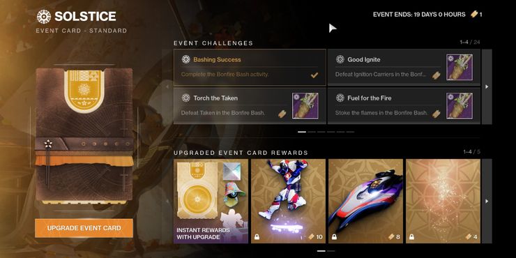 La versión mejorada de Event Card es algo que los Guardianes deberán adquirir a través de Silver, la moneda premium del juego. Sin embargo, los guardianes aún pueden hacer los desafíos del Solsticio antes de comprar la versión mejorada, ya que cada desafío completado los recompensará con un boleto de evento. La única vez que se necesita la versión mejorada es si los cosméticos disponibles son algo que los Guardianes quieren sin duda. Individualmente, los artículos valorados valen más de 3000 de plata si se compraron individualmente. La compra de la tarjeta de evento mejorada cuesta 1000 platas. Con la tarjeta de evento mejorada en la mano, los guardianes deben guardar sus boletos de evento a medida que completan nuevos desafíos.