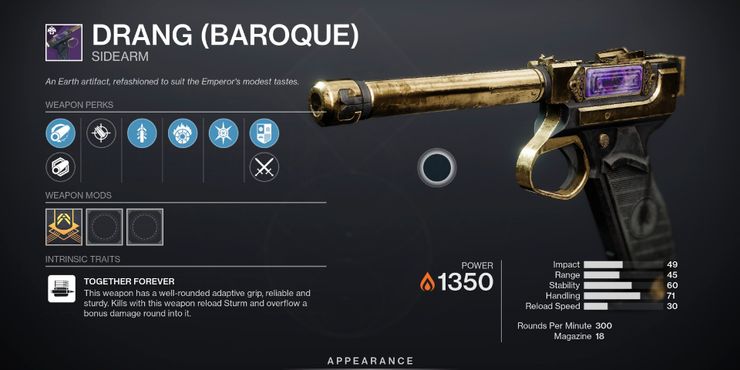 Drang (barroco) es un arma solar reelaborada que regresa en Destiny 2 y que forma parte del conjunto de armas Opulent, y tiene excelentes funciones para PvE y PvP.
