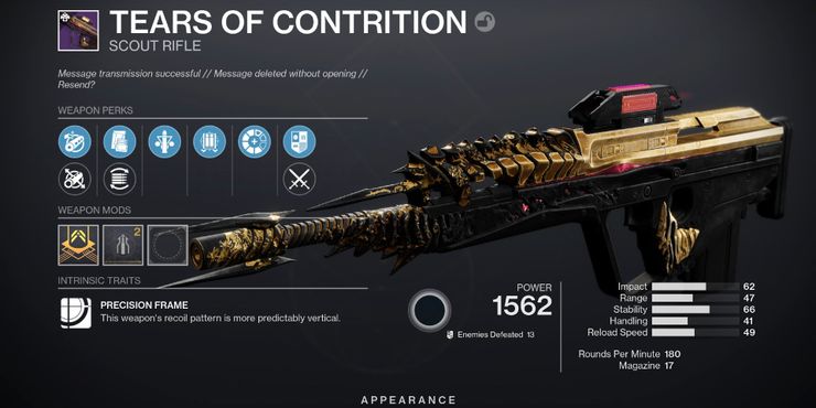 The Tears of Contrition es un nuevo y fantástico rifle Scout en destino 2 eso es parte de la nueva arma embrujada ambientada en temporada 17. Tears of Contrition es un arma Kinetic Precision Frame que tiene muchas combinaciones excelentes de beneficios a pesar de tener solo seis opciones en la tercera y cuarta columna. Los rifles de explorador de marco de precisión también son perfectos para los nuevos jugadores tanto para actividades PvE como PvP gracias a su patrón de retroceso fácil de controlar.