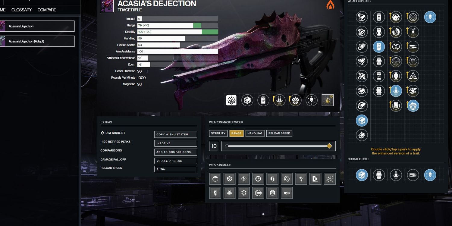 Los rifles de rastreo recibirán una mejora en el futuro, obtendrán un aumento del 4 % en el daño y aumentarán la efectividad de la estabilidad para reducir el retroceso en un 10 % con una estadística de 100. Anteriormente, la estabilidad también obtenía un aumento de la eficacia en la reducción del retroceso. Esto hace que sea increíblemente importante llegar a 100 en la estadística de Abatimiento de Acasia. El Trace Rifle también puede rodar con un conjunto único de Perks que se benefician de los beneficios para la estabilidad.