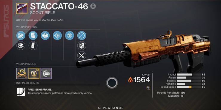 El Staccato-46 es un nuevo rifle Solar Scout en destino 2, y tiene algunas ventajas increíbles para el mejor rollo de Dios. Staccato-46 es un arma de armazón de precisión que tiene una velocidad de disparo de 180 disparos por minuto, lo que la coloca en la misma clase que el rifle Scout de Vault of Glass, es decir, la Visión de la Confluencia. Afortunadamente, el Staccato-46 es un arma mucho más fácil de adquirir que el Raid Scout, y sus beneficios disponibles pueden incluso hacerlo mejor que Vision of Confluence también.