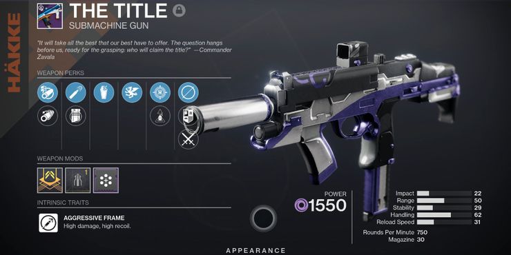 Juegos de guardianes 2022 está oficialmente en vivo en destino 2, y The Title es una nueva recompensa SMG legendaria que los jugadores pueden ganar durante el evento. El título es un nuevo Void SMG con un marco agresivo, lo que significa que inflige un gran daño a cambio de un alto retroceso. La nueva arma también tiene dos Rasgos de Origen que inherentemente caen con todas las tiradas, uno de ellos es el Hakke Breach Armaments que los jugadores conocieron en el lanzamiento de la reina bruja expansión, y el segundo es Classy Contender.