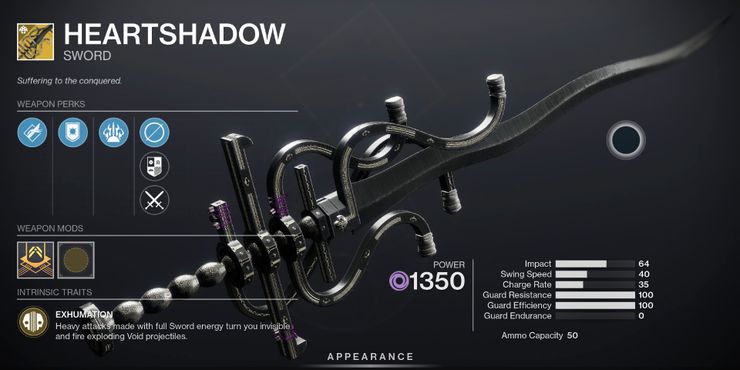 Por defecto, los dos rasgos únicos de Heartshadow la convierten en una de las mejores espadas del juego. La exhumación es su rasgo intrínseco, y vuelve invisibles a los jugadores mientras disparan proyectiles de vacío explosivos cada vez que se realizan ataques pesados con toda la energía de la espada. Disparo en la oscuridad es su rasgo exótico, y hace sinergia con el intrínseco al aumentar el daño infligido mientras los jugadores permanecen invisibles. Además, aplica una desventaja temporal a los objetivos haciéndolos más susceptibles al daño por un corto tiempo.