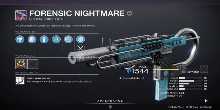 Una vez que los jugadores hayan obtenido dos Forensic Nightmares con Deepsight Reconnaissance, tendrán que extraer ambos patrones usando las armas y completando actividades con las armas equipadas. Después de eso, podrán fabricar una versión del arma en Relic on Mars. Desafortunadamente, los jugadores no podrán poner las mejores ventajas en el arma directamente desde el principio con Destino 2Elaboración de armas. En cambio, tendrán que subir de nivel la Pesadilla Forense elaborada de la misma manera que lo hicieron para extraer los patrones de armas para la Reliquia. Una vez que el arma esté en el nivel 14, tendrán acceso a todos sus rasgos, como Movimiento perpetuo, Lápida y Kill Clip.