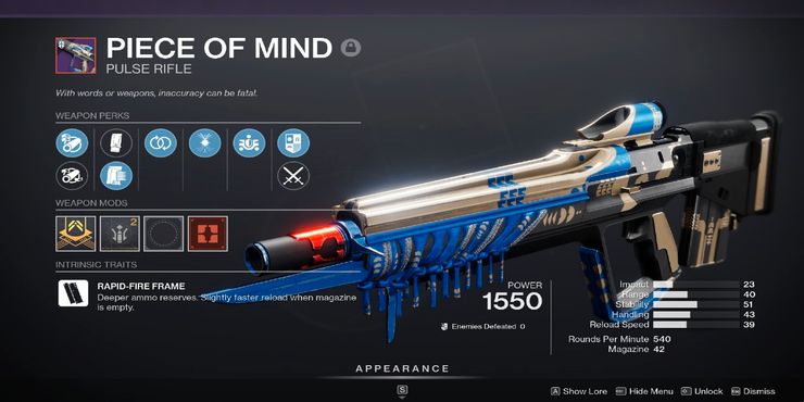 la reina bruja expansión para destino 2 ha introducido más de 40 armas nuevas, y los jugadores finalmente se dan cuenta de cuáles se destacan. Un grupo particular de nuevas armas que se han destacado desde el lanzamiento de la expansión han sido las armas de temporada obtenidas de la Campos de batalla de operaciones psicológicas actividad en el timón. Sin embargo, el nuevo rifle de pulso, Piece of Mind, ha sido el más popular entre los guardianes de todas estas armas. El Piece of Mind es parte del mejor arquetipo de rifle de pulso en el juego con su marco de disparo rápido, pero sus características disponibles y su alta estabilidad hacen que esta arma esté un paso por encima de todas las demás en su clase.