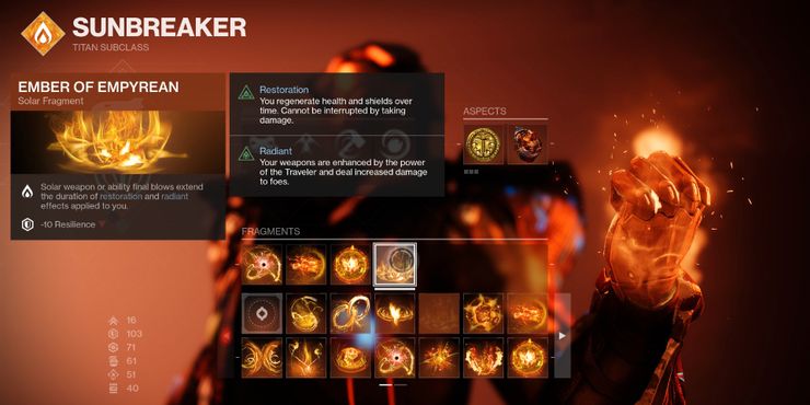 - Ascua de Empíreo (Fragmento): Las armas solares o los golpes finales de habilidad extienden la duración de restauracion y radiante efectos Resta -10 Resiliencia. El God Roll de Calus Mini-Tool con Implacable e Incandescente es una gran arma para usar con este Fragmento seleccionado.
