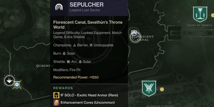 La versión Legend de Sepulcher presenta el modificador Fire Pit. Cada vez que un Acólito es derrotado, arroja un charco de fuego que causa daño con el tiempo. Combinado con el mayor daño solar que causan, gracias a Burn, estos enemigos son una gran amenaza. La dificultad maestra agrega el modificador Chaff, que desactiva el radar dentro del Sector Perdido. Esto no es un gran problema porque la mayoría de los enemigos son fáciles de localizar. Los Guardianes tienen reanimaciones limitadas pero ganan más con la derrota de cada Campeón.