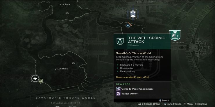 The Wellspring recompensa a los jugadores con armas de Throne World que no están disponibles a través de Deepsight Chests y suben de rango a Fynch en Throne World. El rifle automático ‘Come to Pass’ y el arco ‘Fel Taradiddle’ están disponibles durante The Wellspring: Attack. El lanzagranadas ‘Tarnation’ y el rifle de francotirador ‘Fathers Sins’ están disponibles durante The Wellspring: Defend. Solo hay un arma disponible durante cada rotación de Wellspring, lo que significa que los jugadores pueden tener que esperar tres días si se pierden una rotación de armas.