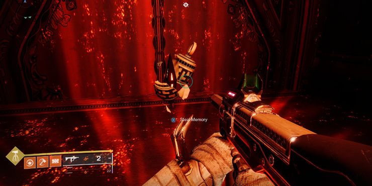 Regrese a la plataforma superior desde la primera memoria reprimida y dispare la campana para ingresar al reino Nightmare. La viga inferior a la derecha ya no estará allí, pero la plataforma permanece. Salta a la plataforma, luego cruza la siguiente plataforma y atraviesa la puerta abierta a la derecha. La segunda memoria reprimida se encuentra en el mismo lugar que la primera al final del largo pasillo. Los jugadores deben usar un arma como el rifle de explorador Tears of Contrition en destino 2 para eliminar a los enemigos circundantes para facilitar el salto.