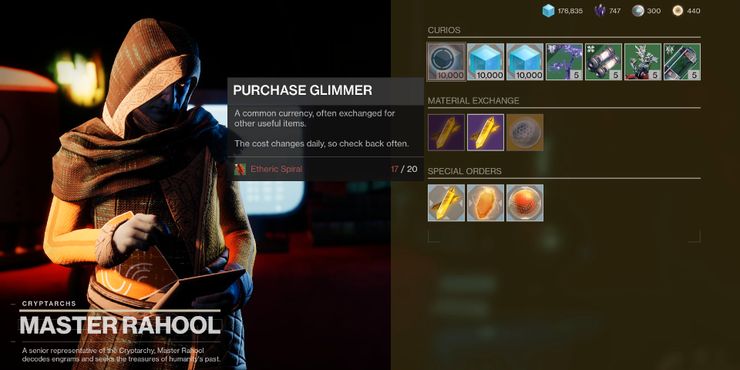 Los guardianes que se encuentran con un exceso de Glimmer deben fabricar gorriones exóticos y almacenarlos en su bóveda. Esta es la forma más fácil de cultivar Glimmer en destino 2, y es particularmente útil para Espirales Etéricas ya que la tasa de cambio es 20 del material planetario por 10,000 Glimmer. Usando 7500 Glimmer y cinco fragmentos legendarios, los jugadores pueden crear gorriones exóticos y almacenarlos en su bóveda hasta que necesiten desmantelarlos. Todos los fragmentos legendarios se devolverán al desmantelar un gorrión fabricado, pero solo se recuperarán 5000 Glimmer. Aunque los jugadores están perdiendo 2500 Glimmer en este intercambio, es mejor que perder todo el Glimmer potencial por no intercambiar ninguna de las Espirales Etéricas en primer lugar. Tenga en cuenta que esto solo se aplica a los jugadores que ya tienen máximo Glimmer y pueden permitirse fabricar gorriones con su abundancia de materiales.