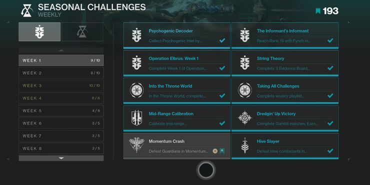 Los guardianes también pueden completar las siguientes recompensas semanales de XP++ y guardarlas también. Además, los jugadores también pueden completar las cinco recompensas semanales de Ada-1 para maximizar sus tejidos de sintetizador para cada personaje. Solo se pueden ganar 10 tejidos de sintetizador por personaje por temporada, por lo que las últimas dos semanas brindan el momento perfecto para completar estas recompensas en cada personaje. Después de completar los Contratos semanales, los jugadores deben concentrarse en los Contratos diarios para las actividades del Crisol, Vanguardia y Gambito en destino 2así como los de Banshee-44 y Saint-14 para que puedan maximizar el total de 63 recompensas que se pueden celebrar.