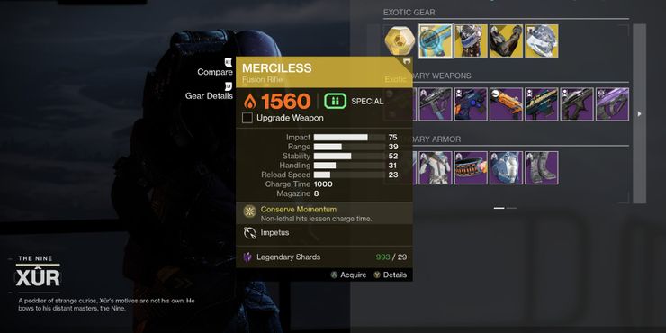 Todos los Guardianes que aún no tengan Merciless deberían elegirlo, especialmente los jugadores más nuevos, ya que puede ser una buena arma para usar contra los jefes antes de que se adquieran otros como el Lanzacohetes Gjallarhorn. Si bien la tirada del Ojo de otro mundo tiene un total de estadísticas alto, la distribución es terrible para los brujos. Los titanes que aún no tengan Citan’s Ramparts deberían recogerlo, aunque una tirada de estadísticas total de 59 deja mucho que desear. Vale la pena agarrar Gwisin Vest, especialmente para los cazadores a los que les encanta usar Spectral Blades Super en actividades PvE.